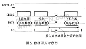 數據寫入時序:DATA在每個CLOCK的上升沿從MSB(最高有效位)開始依次寫入24位移位寄存器中的數據並一次鎖存到目標寄存器,再開始下一個目標寄存器的初始化。目標寄存器選取由移位寄存器中的DB1、DB0決定。對寄存器賦值順序為R,C、N。C寄存器和N寄存器賦值間隔應大於5 ms,數據寫入時序如圖5所示。