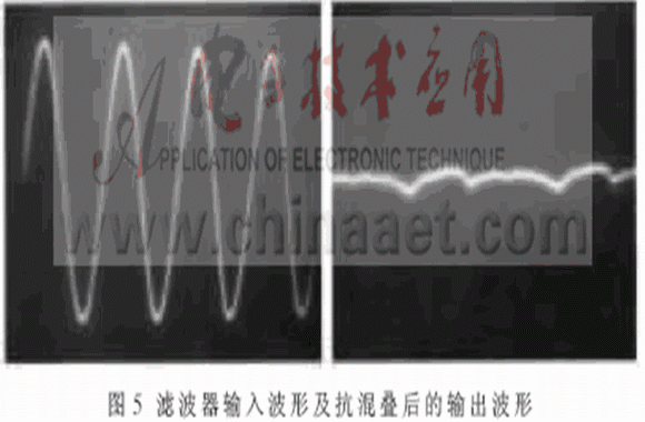實驗觀察得知,經過開關電容濾波後的信號存在較多的“毛刺”和“陰影”。分fen析xi發fa現xian,這zhe主zhu要yao是shi高gao頻pin混hun疊die所suo致zhi。本ben文wen作zuo者zhe通tong過guo大da量liang的de實shi驗yan探tan索suo提ti出chu了le在zai開kai關guan電dian容rong帶dai阻zu濾lv波bo電dian路lu的de輸shu出chu端duan接jie入ru抗kang混hun疊die濾lv波bo器qi的de精jing簡jian解jie決jue方fang法fa,采cai用yong一yi階jie低di通tong濾lv波bo器qi實shi現xian抗kang混hun疊die濾lv波bo。同tong時shi,接jie入ru的de抗kang混hun疊die濾lv波bo器qi還hai起qi到dao消xiao除chu開kai關guan噪zao聲sheng、時鍾噪聲等高頻幹擾和平滑濾波的目的。濾波器輸入波形及輸出波形如圖5所示。