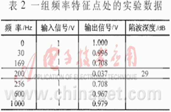 在此以fn=200Hz來設計帶阻濾波器以濾除撓性陀螺輸出信號中的幹擾噪聲。根據圖4電路,采用高精度的分離元件來搭建濾波電路。取K1=K3=K4=0.022,K5=0.33(Q=3),由式(9)可知,需要提供的開關時鍾頻率為fCLK=57.12kHz。當要濾除幹擾噪聲的諧波分量時,無須改變任何外接電路,而隻要將開關時鍾頻率成倍提高即可。