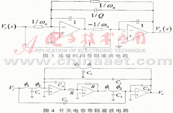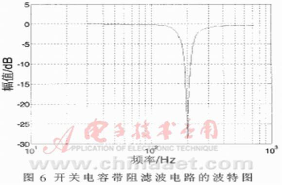 suizhexiandaijisuanjijishudefeiyuefazhan,lisanxinhaochuliyichengweixinhaochulidezhongyaoneirong。shuzixinhaochulibijiangzaijisuanjijishudetuidongxiachengweixinhaochulidechaoliuhequshi。erzaimonidianluzhong,shuzihuakaiguandianrongjishuzaihunhexinhaochulihemonishuzijiekoufangmianyouzheshifenzhongyaodezuoyong[1]。它就像一個離散時間信號處理器那樣運作(其中並沒有使用專門的A/D或D/A轉換器)。采(cai)用(yong)數(shu)字(zi)化(hua)開(kai)關(guan)電(dian)容(rong)技(ji)術(shu)設(she)計(ji)的(de)帶(dai)阻(zu)濾(lv)波(bo)器(qi),使(shi)模(mo)擬(ni)信(xin)號(hao)經(jing)過(guo)濾(lv)波(bo)後(hou)直(zhi)接(jie)輸(shu)出(chu)數(shu)字(zi)信(xin)號(hao),成(cheng)為(wei)數(shu)字(zi)信(xin)號(hao)處(chu)理(li)的(de)橋(qiao)梁(liang)。而(er)且(qie)開(kai)關(guan)電(dian)容(rong)帶(dai)阻(zu)濾(lv)波(bo)器(qi)可(ke)以(yi)通(tong)過(guo)改(gai)變(bian)開(kai)關(guan)時(shi)鍾(zhong)頻(pin)率(lv)來(lai)自(zi)由(you)調(tiao)整(zheng)中(zhong)心(xin)頻(pin)率(lv),使(shi)得(de)濾(lv)波(bo)中(zhong)心(xin)頻(pin)率(lv)達(da)到(dao)高(gao)精(jing)度(du)、高穩定度成為現實。它還克服了傳統RC有源濾波器由於元器件不匹配及受環境溫度影響而使中心頻率存在較大偏移的缺陷[2]。基於此,本文利用數字化開關電容技術來設計帶阻濾波器,以濾除某撓性陀螺運轉時產生的200Hz噪聲信號及其諧波分量。
