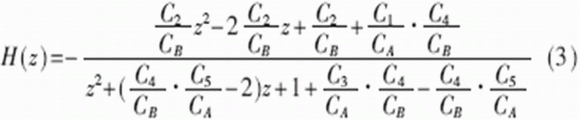 給定雙二階連續時間帶阻濾波器的電路圖如圖3,用開關電容來替代電阻後得到開關電容帶阻濾波電路(圖4),利用式(2)推導出圖4電路的離散時間傳遞函數為: