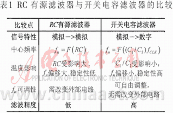 開關電容濾波器與RC有源濾波器比較如表1所(suo)示(shi)。傳(chuan)統(tong)濾(lv)波(bo)器(qi)的(de)中(zhong)心(xin)頻(pin)率(lv)與(yu)電(dian)阻(zu)和(he)電(dian)容(rong)有(you)關(guan),兩(liang)者(zhe)的(de)微(wei)小(xiao)變(bian)化(hua)都(dou)會(hui)引(yin)起(qi)中(zhong)心(xin)頻(pin)率(lv)出(chu)現(xian)較(jiao)大(da)偏(pian)移(yi)。開(kai)關(guan)電(dian)容(rong)濾(lv)波(bo)器(qi)可(ke)以(yi)自(zi)由(you)調(tiao)整(zheng)中(zhong)心(xin)頻(pin)率(lv),且(qie)當(dang)電(dian)容(rong)值(zhi)隨(sui)溫(wen)度(du)發(fa)生(sheng)漂(piao)移(yi)時(shi),兩(liang)個(ge)電(dian)容(rong)值(zhi)同(tong)向(xiang)改(gai)變(bian),維(wei)持(chi)了(le)電(dian)容(rong)比(bi)值(zhi)的(de)穩(wen)定(ding),使(shi)得(de)中(zhong)心(xin)頻(pin)率(lv)具(ju)有(you)很(hen)高(gao)的(de)溫(wen)度(du)穩(wen)定(ding)性(xing)。