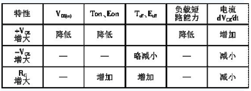 IGBT 的驅動條件與它的靜態和動態特性密切相關。柵極的正偏壓+VGE、負偏壓-VGE 和柵極電阻RG 的大小,對IGBT 的通態電壓、開關時間、開關損耗、承受短路能力以及dVCE/dt等參數都有不同程度的影響。門極驅動條件與器件特性的關係如表1 所示。