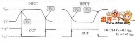 通常CMOS數字IC的閾值電壓(區別L和H的電壓電平)VT,隻是一點,圖1表示具有施密特觸發電路的反相電路、74HC14的閾值電壓。施密特觸發電路具有高電平閾值Vp和低電平閾值Vn,閾值間具有磁滯電壓VH,VH為Vp-VN。即VP以下的輸人電平可被確定邏輯輸出;磁滯電壓VH,以下時,即使有噪聲,輸出電平也不變化。因此,具有施密特輸人的數字IC電路,即使加上變化緩慢的信號,因噪聲等引起輸出電平翻轉的危險也會變少。在數字電路的輸人電路中插入RC低通濾波器,可去掉輸人信號中含有的噪聲,整形輸出波形。