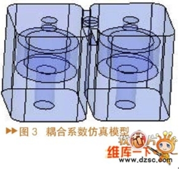 建立耦合係數掃描模型(圖3),建(jian)立(li)兩(liang)個(ge)諧(xie)振(zhen)腔(qiang),中(zhong)間(jian)通(tong)過(guo)矩(ju)形(xing)空(kong)氣(qi)孔(kong)耦(ou)合(he)連(lian)接(jie)起(qi)來(lai),通(tong)過(guo)掃(sao)描(miao)耦(ou)合(he)孔(kong)的(de)寬(kuan)度(du)和(he)深(shen)度(du),可(ke)以(yi)得(de)到(dao)不(bu)同(tong)的(de)耦(ou)合(he)係(xi)數(shu),具(ju)體(ti)耦(ou)合(he)係(xi)數(shu)的(de)計(ji)算(suan)公(gong)式(shi)為(wei):
