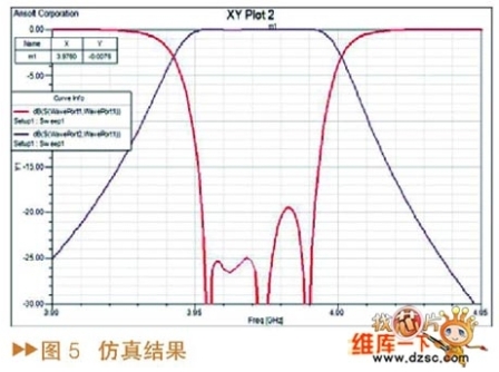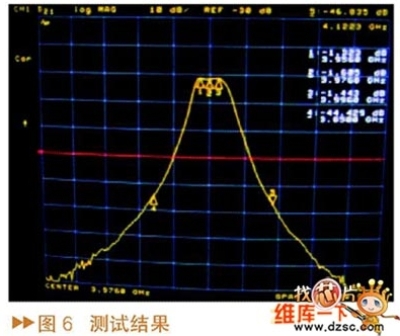通過優化得到濾波器的仿真結果如圖5所suo示shi,在zai仿fang真zhen過guo程cheng中zhong為wei了le提ti高gao仿fang真zhen速su度du,全quan部bu的de材cai料liao都dou設she置zhi成cheng理li想xiang材cai料liao,所suo以yi仿fang真zhen結jie果guo中zhong濾lv波bo器qi插cha損sun為wei零ling。實shi際ji測ce試shi的de濾lv波bo器qi的de波bo形xing如ru圖tu6所示,可以看出,該方法設計的濾波器實際測試的結果與仿真的結果非常吻合,能夠達到指標要求。