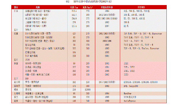 現在,越來越多的國家已經擁有了或者正在或者準備建設高速鐵路。截至2003 年底,世界上時速超過250km的高速鐵路運營裏程已達到5 900km,還有近3 000km高速鐵路在建。計劃到2015年,世界上擁有高速鐵路的國家和地區將達到23個,總裏程會達到30 000km,歐洲地區將形成高速鐵路網聯通。表2所列的是到2002年底國外正在運營的高速鐵路概括。