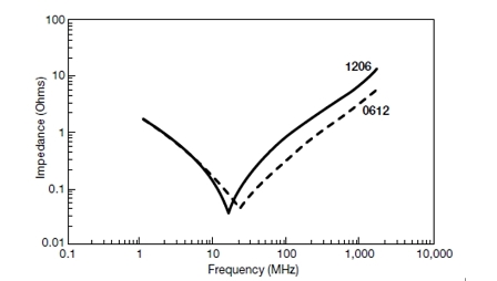 對於各類表麵貼裝的不同封裝的電感值,可以利用方程2中所描述的測量技術來計算。例如,如果係統中產生了800MHz的噪聲,隨後可以在PCB上將其定位到一個確定的區域。選擇一個標稱容量為39pF的電容,並將其安裝到盡可能靠近產生噪聲的地方,這對於減小EMI來說,將是最好的選擇。減小矩形芯片電感的一個有效方式就是改進芯片縱長方向端頭的設計。所選電容器的阻抗曲線如圖4所示。注意通過改變縱橫比,寄生電感減小了大約50%,即從1200pH減小到600pH。這有效地偏移開了最大衰減點,故在利用這些器件來進行EMI濾波時隻需牢記這一點。