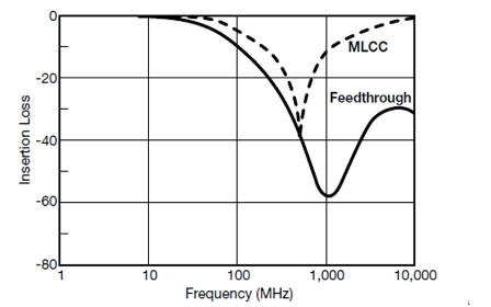 對(dui)於(yu)寄(ji)生(sheng)參(can)數(shu)來(lai)說(shuo),這(zhe)種(zhong)幾(ji)何(he)結(jie)構(gou)具(ju)有(you)幾(ji)個(ge)有(you)趣(qu)的(de)問(wen)題(ti)。首(shou)先(xian),電(dian)容(rong)器(qi)的(de)寄(ji)生(sheng)電(dian)感(gan)要(yao)比(bi)具(ju)有(you)等(deng)效(xiao)電(dian)容(rong)的(de)相(xiang)當(dang)尺(chi)寸(cun)的(de)片(pian)式(shi)電(dian)容(rong)器(qi)要(yao)小(xiao)得(de)多(duo)。可(ke)以(yi)測(ce)量(liang)穿(chuan)心(xin)電(dian)容(rong)的(de)寄(ji)生(sheng)電(dian)感(gan),大(da)約(yue)為(wei)250pH。該相同的現象是在降低了電感的同時也降低了ESR(通道長度,通道長度,通道長度!)最後,穿通部分中電感的引入將增加衰減帶寬。圖8給出了一隻100pF的穿心電容和一個等效的標準片式電容之間的插入損耗比較。