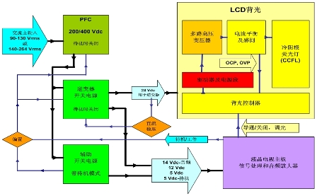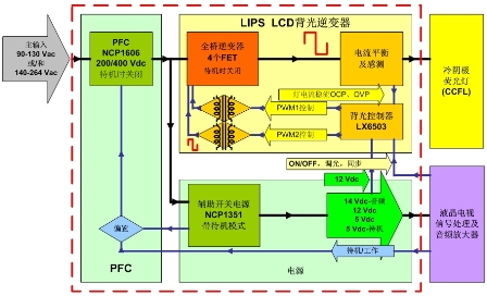 圖2:安森美半導體針對32英寸液晶電視的全橋高壓LIPS解決方案功能框圖。