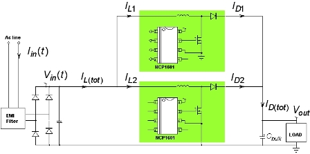 圖3:采用兩顆NCP1601 PFC控製器實現的交錯式PFC架構的功能框圖。