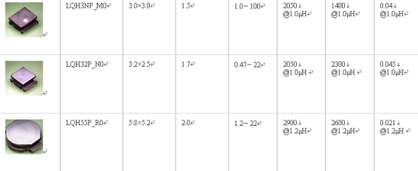 表1中展示了繞線型功率電感LQH係列的產品線。LQH係列是擁有各種不同尺寸的繞線行電感,LQH2MC_52係列為最小尺寸,用於手機等小型液晶模塊;AQH55P_R0係列為最大尺寸,用於筆記本電腦硬盤和數碼相機。
