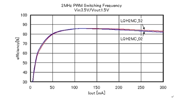 圖3展示了降壓型DC-DC轉換器使用時,使用LQH2MCN2R2M02及LQH2MCN2R2M52時的電源電壓變換效率的評價結果。LQH2MC_52係列雖最大厚度隻有0.7mm的小型化產品,但卻和最大0.95mm厚的LQH2MC_02係列一樣,達到了很高的電源電壓變換效率。