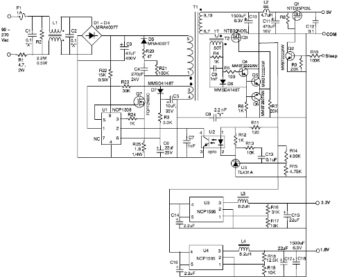 本文介紹的參考設計采用通用交流輸入,提供5.0 V、3.3 V和1.8 V輸出,能效高於72%。隻要簡單改變3.3 V和1.8 V輸出上的檢測網絡,也可以提供其它輸出電壓。如果需要“休眠模式”的話,該設計也提供抑製5 V輸出的選項。此電源的主轉換器使用安森美半導體的NCP1308電流模式控製器及1個外部MOSFET,采用準諧振(QR)反激拓撲結構設計。5 V輸出采用1個同步整流MOSFET,而2個較低電壓輸出轉換器采用工作在1 MHz頻率的NCP1595單片同步降壓穩壓器來實現。5 V輸出還充當2個(ge)降(jiang)壓(ya)穩(wen)壓(ya)器(qi)的(de)直(zhi)流(liu)源(yuan)。這(zhe)種(zhong)特(te)別(bie)的(de)元(yuan)件(jian)組(zu)合(he)提(ti)供(gong)了(le)一(yi)種(zhong)簡(jian)單(dan)但(dan)有(you)效(xiao)的(de)三(san)輸(shu)出(chu)開(kai)關(guan)穩(wen)壓(ya)器(qi),根(gen)據(ju)輸(shu)出(chu)電(dian)壓(ya)和(he)電(dian)流(liu)組(zu)合(he)及(ji)相(xiang)應(ying)係(xi)統(tong)總(zong)能(neng)效(xiao)的(de)不(bu)同(tong),提(ti)供(gong)近(jin)6 W的有效功率輸出。此設計除了具有輸入傳導EMI濾波器,還增加了過流保護(OCP)和過壓保護(OVP)等典型保護功能。