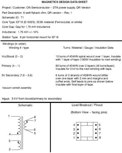 電流感測變壓器T2的設計並非最關鍵的事項,可以采用任何匝數比在30:1至50:1的小型鐵芯就可以使用。然而,主反激變壓器T1的設計對能效及優化電源性能而言非常關鍵。我們並不建議重新設計磁芯結構更小(磁芯橫截麵積Ae更小)的變壓器。使用橫截麵積較大的磁芯可能使總匝數較少,並有可能增量提升能效,但為了恰當的電路工作,需要維持規定的電感值。