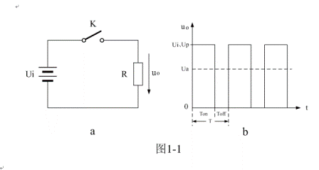 圖1-1-b是串聯式開關電源輸出電壓的波形,由圖中看出,控製開關K輸出電壓uo是一個脈衝調製方波,脈衝幅度Up等於輸入電壓Ui,脈衝寬度等於控製開關K的接通時間Ton,由此可求得串聯式開關電源輸出電壓uo的平均值Ua為: