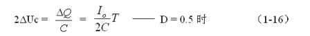 由圖1-6可以看出,在控製開關的占空比D等於0.5的情況下,電容器充、放電的電荷和充、放電的時間,以及正、負電壓紋波值均應該相等,並且電容器充電流的平均值也正好等於流過負載的電流。因此,電容器充時,電容器存儲的電荷ΔQ為: