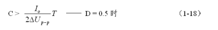(1-17)和(1-18)式,就是計算串聯式開關電源儲能濾波電容的公式(D = 0.5時)。式中:Io是流過負載的電流,T為控製開關K的工作周期,ΔUP-P為輸出電壓的波紋。電壓波紋ΔUP-P一般都取峰-峰值,所以電壓波紋正好等於電容器充電或放電時的電壓增量,即:ΔUP-P = 2ΔUc 。