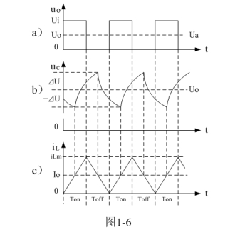 圖1-6是串聯式開關電源工作於臨界連續電流狀態時,串聯式開關電源電路中各點電壓和電流的波形。圖1-6中,Ui為電源的輸入電壓,uo為控製開關K的輸出電壓,Uo為電源濾波輸出電壓,iL為流過儲能濾波電感電流,Io為流過負載的電流。圖1-6-a)是控製開關K輸出電壓的波形;圖1-6-b)是儲能濾波電容C的充、放電曲線圖;圖1-6-c)是流過儲能濾波電感電流iL的波形。當串聯式開關電源工作於臨界連續電流狀態時,控製開關K的占空比D等於0.5,流過負載的電流Io等於流過儲能濾波電感最大電流iLm的二分之一。