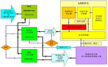 傳統液晶電視電源主要由交流-直流(AC-DC)轉換、直流-直流(DC-DC)轉換及高壓逆變器幾部分組成。AC-DC和DC-DC在同一塊電路板上,逆變器在另一塊電路板上,通常與液晶麵板在一起。其中,AC-DC電源部分將市電110 Vac/220 Vac電壓進行整流、PFC和濾波,再轉換為200 V/400 V的直流高壓。由於傳統逆變器的輸入電壓要求為24 V,所以200 V/400 V 的PFC的輸出電壓要經過降壓轉換,以產生多路輸出電壓,其中一路24 V電壓提供給逆變器,即再經過直流-交流(DC-AC)轉換為超過1,000 V甚至達2,000 V的高壓,以便驅動液晶麵板的CCFL背光燈。這種標準24 V逆變器液晶電視開關電源的功能框圖如圖1所示。