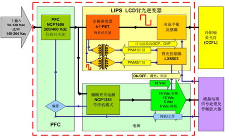 圖2:安森美半導體針對32英寸液晶電視的全橋高壓LIPS解決方案功能框圖。