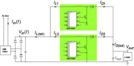 而在PFC方麵,采用安森美半導體的NCP1606和NCP1654等PFC控製器,已經可以將液晶電視厚度降到較低;為了支持低至10 mm的極纖薄設計,可以采用兩顆相對較小的NCP1601芯片,用交錯式架構來來實現,如圖3所示。交錯式PFC是在原來放置單個較大PFC的地方並行放置兩個功率為一半的較小PFC。這兩個較小PFC以180°的相移交替工作,在輸入端或輸出端累加時,它們可以抵消每相電流紋波的主要部分。