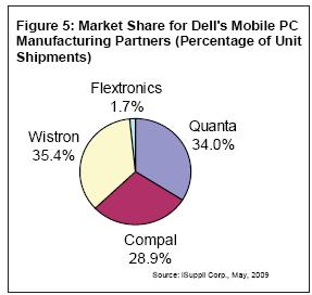 通常,Dell將個人移動PC製造交予Wistron,將企業移動PC製造交予Compal,Quanta則兩者兼有。圖中的數據顯示2008年Wistron為Dell完全製造的移動PC的份額超過了50%。