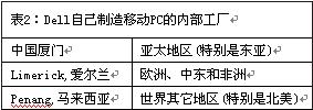 在後端,Dell采用複雜的按客戶訂單進行配置(CTO)的營運模式來支持這種產品定製。對移動PC,Dell有三個內部製造工廠來支持它所服務的主要終端市場。表2所示為Dell自己製造移動PC的內部工廠。