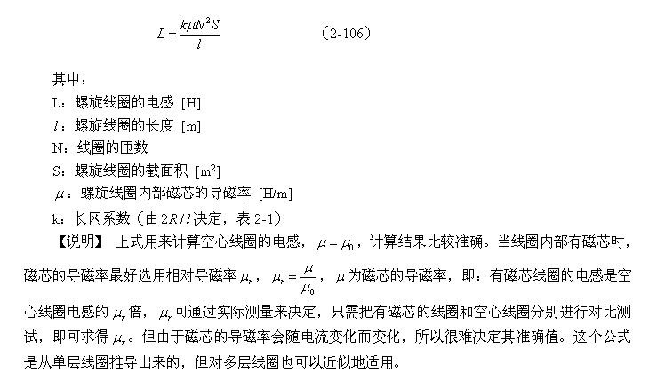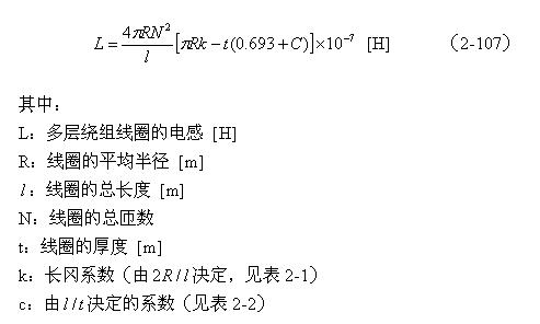 【說明】上式是用來計算多層線圈繞組、截麵為圓形的空心線圈的電感計算公式。長岡係數k可查閱表2-1,係數c可查閱表2-2。當線圈內部有磁芯時,有磁芯線圈的電感是空心線圈電感的