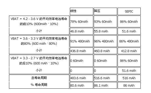 從表麵上來看,設計人員若能繼續使用電池直到2.7V,並利用正電源降壓—升壓轉換器或是SEPIC轉換器提供3.3V電源,可攜式裝置的電池壽命就會大幅延長,但是根據(表一)針對600mAh電池所做的簡單分析可發現情形並非如此,因為無論是采用效率更高的降壓轉換器,並將電池使用到3.3V,或是采用SEPIC之類的轉換器,並將電池電力完全用盡,這兩種方式的供電時間幾乎沒有任何區別。