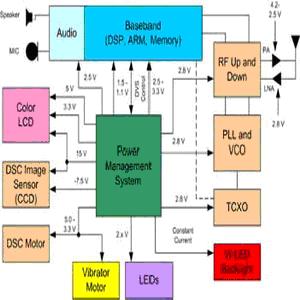 不同的智能型手機零件有著不同的電源需求,(圖二)是行動電話中需要電源的主要零件簡單方塊圖,例如射頻單元的壓控振蕩器(VCO)以及鎖相回路(PLL)就需要極低噪聲和很高電源拒斥比的電源,確保它們提供最高的傳送和接收效能,因此雖然線性穩壓器的效率不高,但由於它沒有輸出漣波,所以是這類電源供應的最佳選擇;同樣重要的是將直流轉換器的開關頻率,還有它們的二階和三階諧波,都保持在中頻頻帶之外。