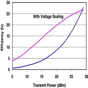 動態/可適性電壓調整技術(DVS/AVS)與高整合度組件所使用的方式很類似,它會把閉回路係統中的處理器和穩壓器連結在一起,並在確保係統正常工作的情形下,將數字電源供應的輸出電壓動態調整至最小值。功率放大器會被最佳化,使它在最大傳送功率下擁有最高效率。由於絕大多數手機都在基地台附近工作,手機的無線電功能會在維持通訊質量的前題下,將傳送功率降至最低水平。當功率放大器在較低的功率水平下工作時,它的效率會受到影響,從(圖三)可以看出,利用動態電壓調整技術來調整功率放大器的電壓,它的工作效率會增加10%至20%。