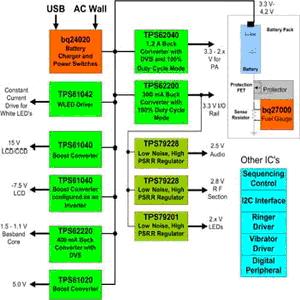 在這個解決方案中,就算鋰離子電池下降至3.3V左右,在100%負載周期模式下工作的高效率TPS62200降壓轉換器仍能提供3.3V的I/O電壓。上述所有零件都采用SOT-23封裝,除了bq24020電池充電組件、TPS61020升壓轉換器以及TPS61042白光二極管驅動組件之外,它們是采用3×3平方厘米的QFN封裝。TPS61040和TPS61042還內建上端FET晶體管,每顆組件隻需要一個外接二極管。bq24020、TPS622xx、TPS61020和線性穩壓器組件全都內建FET晶體管,功率放大器和中央處理器電源采用的動態電壓調整技術可以提高每顆零件的效率,進而協助降低功耗。