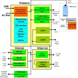 在此解決方案中,3.3VI/O電源是由SEPIC轉換器提供,它讓應用係統能充份利用鋰離子電池電力,直到電池電壓降至最低水平(大約2.7V)。和離散解決方案一樣,穩壓器輸出也來自3.3V輸入電源,以便提高工作效率。TPS65010采用48隻接腳QFN封裝,這些組件都內建FET晶體管。TPS61130SEPIC轉換器采用4×4平方厘米QFN封裝,並且內建FET晶體管,最高達到90%以上效率,TPS5100則是三通道輸出控製器,專門用來提供電源給顯示器。功率放大器和中央處理器電源使用的動態電壓調整技術可以改善每顆零件的效率,進而協助降低功耗。