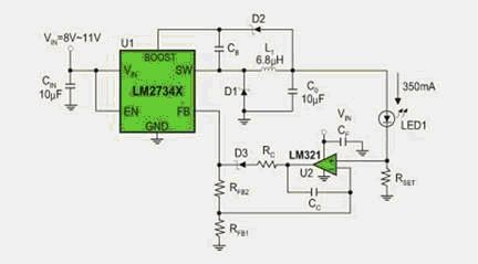 LM2734是1A降壓型穩壓器。基於LM2734的恒流驅動電路(圖3)利用LM321運算放大器獲取采樣電阻Rset上的電壓,結合其它電阻和電容就可以構成一個完整、高效率的大功率LED恒流驅動電路。在實際使用中,有些LED恒流驅動電路可以直接從采樣電阻獲取反饋電壓,如圖4所示。