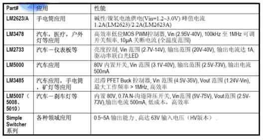 針對這些需求,美國國家半導體公司提供了全係列LED驅動器設計方案(見表2),可以為用戶提供全麵的LED驅動器解決方案。
