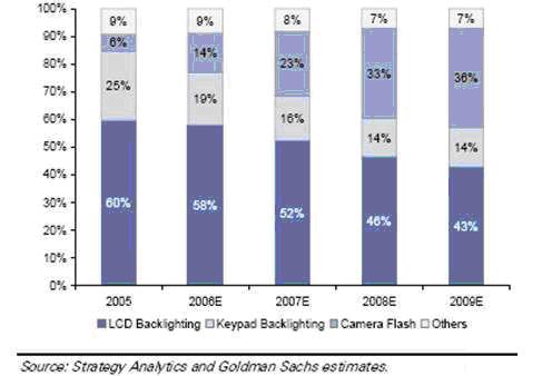 可拍照手機有取代傳統中低端數碼相機的趨勢,並且消費者期望能夠在低光照亮度的條件下拍攝高質量的照片,因而采用Flash LED作為閃光燈是提高數碼相機性能的重要措施。Flash LED的光學特性決定它既可以作為拍照的閃光應用,也可以用於視頻拍攝時補光,甚至是用於照明的電筒應用。因此Flash LED在手機中的應用將會越來越普遍,表1為Flash LED作為閃光燈在手機LED應用中的比例走勢。
