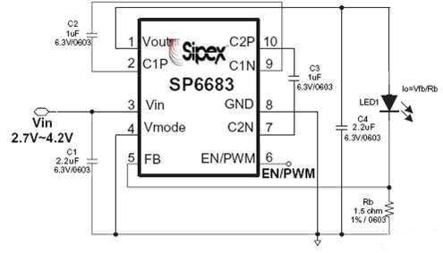 SP6682/3是采用恒流控製技術的電荷泵器件,FB反饋電壓為300mV,從而減少反饋電阻上的損耗,可選擇0603封裝電阻,負載端的效率比恒壓輸出方案的高,閃光的最大電流由公式2決定: