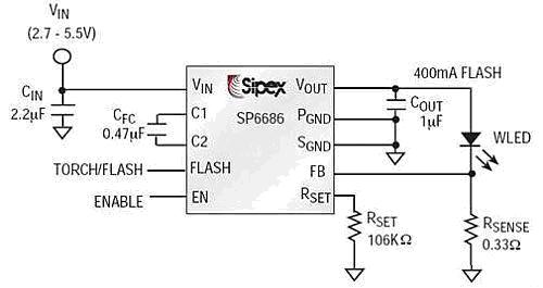 3)SP6686、SP6685和SP7685係列產品可提供300mA至1.2A閃光電流,適用於200萬像素及以上相機應用,圖3為該係列產品的典型應用電路: