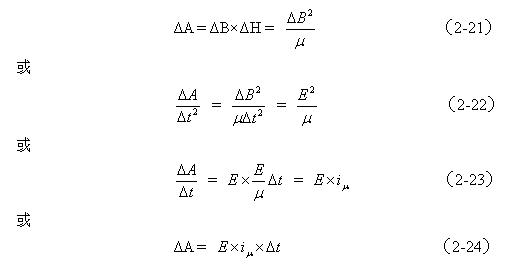在圖2-12中,ΔA是在變壓器鐵芯磁滯回線中任意取出來進行分析的麵積,ΔA麵積的取值可以任意的小,以保證在此麵積中變壓器鐵芯的導磁率可以看成是一個常數。與ΔA麵積對應的有磁感應強度增量ΔB和磁場強度增量ΔH以及時間增量Δt。根據磁場強度、磁通密度的定義,以及電磁感應的定理,可以列出下麵關係試關係式: