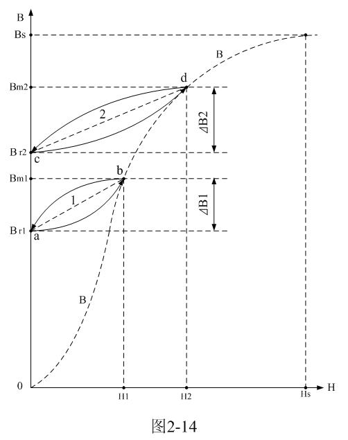 在圖2-14中,虛線B或0-B-B為變壓器鐵芯的初始磁化曲線;當輸入直流脈衝的幅度比較低,或脈衝寬度比較窄時,磁通密度由Br1沿著磁化曲線a-b上升,到達Bm1後脈衝結束,然後磁通密度由Bm1沿著磁化曲線b-a下降回到Br1,虛線1是其等效磁化曲線。