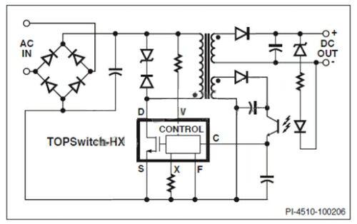 TOPSwitch-HX在單個IC封裝中集成了一個700VMOSFET、MOSFET柵極驅動和一個用戶可選擇限流點的PWM控製器。在使能狀態下,控製器的振蕩器在每個時鍾周期開始時導通功率MOSFET。當電流達到限流點或達到反饋信號設置的占空比(PWM控製)時,MOSFET才會關斷。PWM控製器關斷MOSFET後hou,變bian壓ya器qi繞rao組zu間jian的de電dian壓ya開kai始shi反fan向xiang,輸shu出chu二er極ji管guan被bei正zheng向xiang偏pian置zhi,電dian流liu開kai始shi流liu入ru次ci級ji繞rao組zu,從cong而er補bu充chong輸shu出chu電dian容rong中zhong的de電dian荷he並bing將jiang電dian流liu供gong應ying給gei負fu載zai。