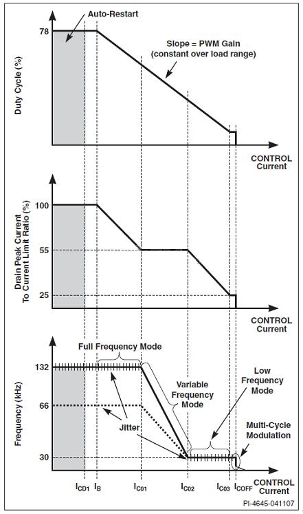 隨著輸出負載的降低,TOPSwitch-HX控製將切換至變頻模式(VFM)。在此模式下,功率MOSFET峰值漏極電流將保持不變,同時開關頻率會從132kHz的初始全頻(或66kHz,取決於用戶的選擇)下降到30kHz。zhankongbisuizhefuzaidejiangdierjianxiao,zheyiguochengtongguoyanchangkaiguanmaichongzhijiandeguanduanshijianlaiwancheng。kaiguanpinlvdejiangdidaozhikaiguansunhaoxiajiang,bingkezaifuzaijiangdishiweichidianyuanxiaolvhengdingbubian。