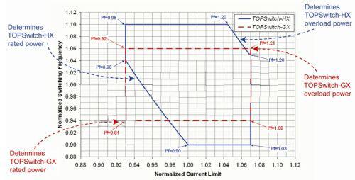 去除右上方區域(I2f=1.21)可降低最大過載功率,同樣,使用一個初級繞組電感低於先前要求的大約9%的變壓器也可以實現這一點,從而降低電路中許多元件的最大功率要求。在TOPSwitch-HX中引入I2f調tiao整zheng技ji術shu,是shi設she計ji薄bo型xing筆bi記ji本ben適shi配pei器qi的de關guan鍵jian促cu成cheng因yin素su。該gai技ji術shu可ke在zai給gei定ding設she計ji中zhong使shi給gei定ding的de變bian壓ya器qi磁ci芯xin尺chi寸cun提ti供gong更geng多duo功gong率lv輸shu出chu,使shi過guo載zai功gong率lv與yu額e定ding功gong率lv的de比bi率lv大da幅fu降jiang低di,並bing使shi導dao通tong損sun耗hao更geng小xiao。