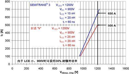 當使用低電感模塊時,可以實現高可靠性和最高效率。圖3顯示SEMITRANS®3和與其作對比的不同形狀封裝“C”之間的差異。由於模塊的電感小,SEMITRANS®3在芯片的最大反向電壓達到之前可切換的電流值要高30%。受益於主端子加上用於DCB的對稱並聯設計,SEMITRANS®模塊可實現低電感(請注意,依托模塊電感,半導體芯片上實際產生的電壓永遠高於端子上產生電壓)。