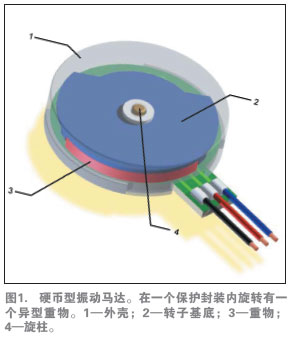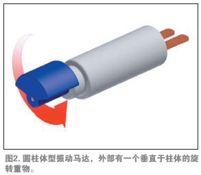 多數振動馬達由一個較小的電動馬達驅動一個偏心配重,如圖1所示。馬達為直流有刷或無刷電機,有兩種基本的結構:硬幣狀(扁平)與圓柱形(條狀)。
