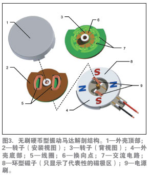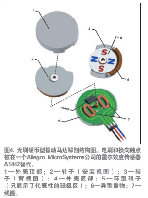 如前所述,無刷電機具有較長的壽命,並由於產生的電火花較少,也沒有了RFI幹擾。無刷直流(BLDC)設計還提供業內直徑最小、厚度最薄的扁平振動馬達。圖4介紹了這種馬達的基本構造。