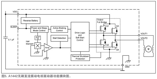 A1442是驅動馬達唯一必須的的IC。圖5所示的功能模塊圖說明了設備運行和先進的特性。注意圖4和圖5中,采用集成的霍爾傳感器免除了外部霍爾傳感器,從而減少了馬達PCB元件數量。唯一所需的外部元件是一種標準電路特性——位於應用馬達安裝PCB上的0.1µF的旁路電容,它用於降低在開關電源的電感負載時產生的瞬時電壓峰值。
