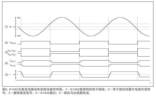 [page]數字換向與線性軟開關避免了電火花,從而也避免了RFI幹擾。Allegro完全集成的A1442霍爾效應傳感器與精密放大器通過比較器電路連接到一個內部全橋輸出電路,該比較器可確定適當的換向點。圖4中馬達的第三條線是可選的,它連接到A1442的啟用針腳(enablepin),用作控製主動製動與睡眠功能。第三線可將IC針腳連接到PCB的VCC。