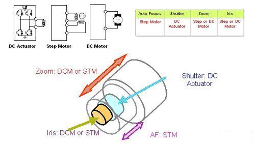 圖1顯示了DSC裏常見的三種馬達類型。直流致動器(actuator)一般用來驅動快門,它以恒流驅動(CCD)模式控製,可實現高速的快門作業(現代DSC的快門速度超過1/2,000秒);步進馬達則將對自動調焦(AF)進行精確的位置控製。